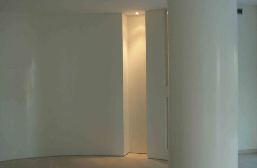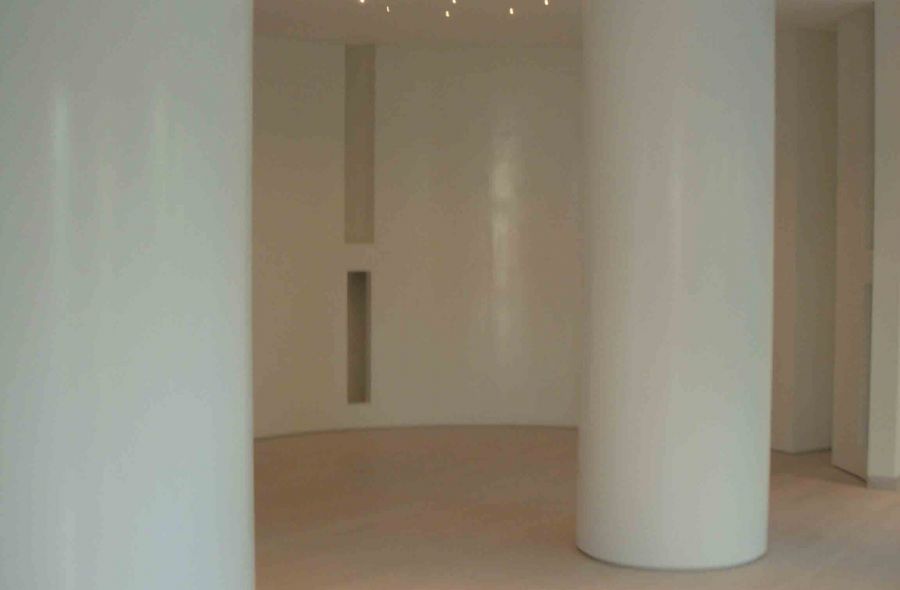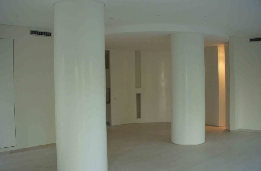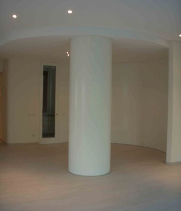 La “pancia”con le colonne fissa il baricentro del soggiorno, che esplode verso il verde dei giardini pubblici.