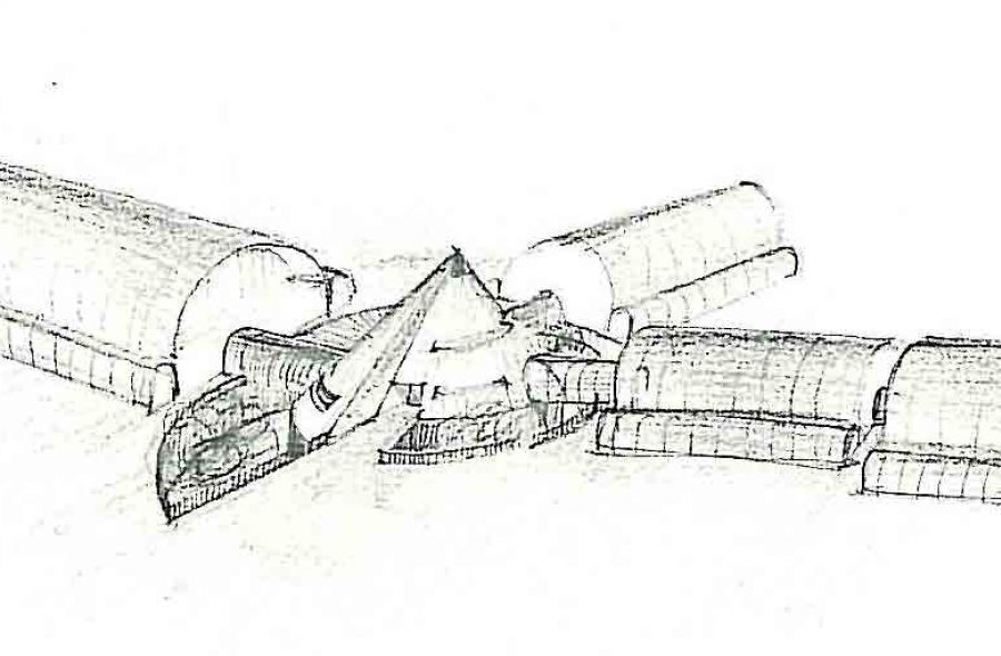 Dal cono centrale, cuore dell’impianto, esplodono a raggiera, attraverso ponti coperti, gli edifici di ricerca biotecnologica, chiaramente separati tra loro.