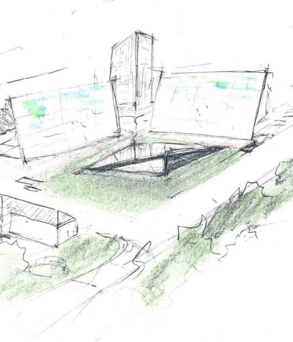 L’impatto all’entrata del nuovo complesso ė volutamente scenografico : le grandi pareti specchiate amplificano la zona arborea circostante.
