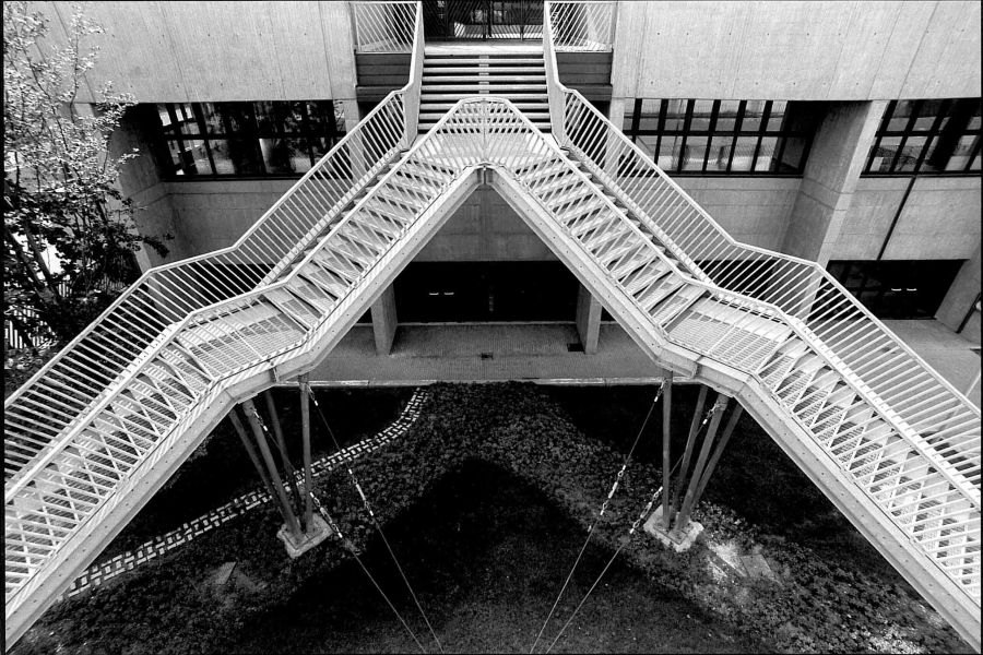 Le scale esterne in ferro zincato aggrediscono l’edificio come animali preistorici.
