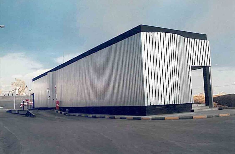 La “pelle” di lamiera zincata riveste quest’edificio che propone un tema singolare: la pesa dei camions in entrata ed in uscita.