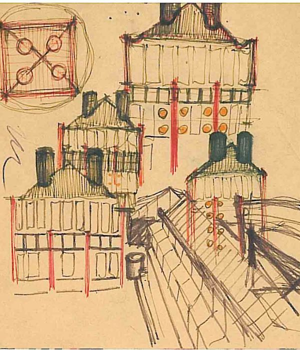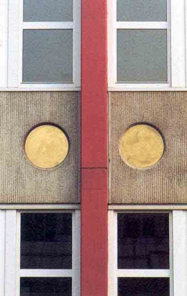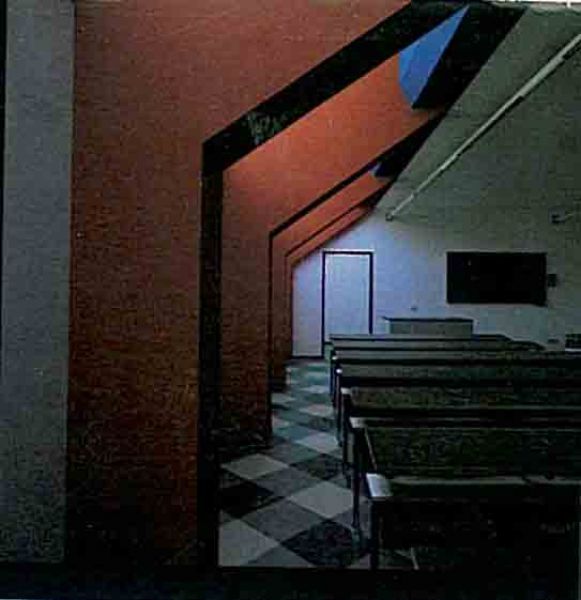 L’intervento cromatico coi rossi, blu e oro riscattano e vivificano il grigio del prefabbricato.