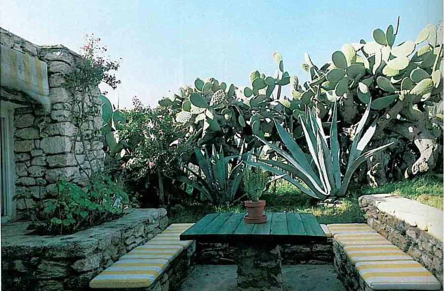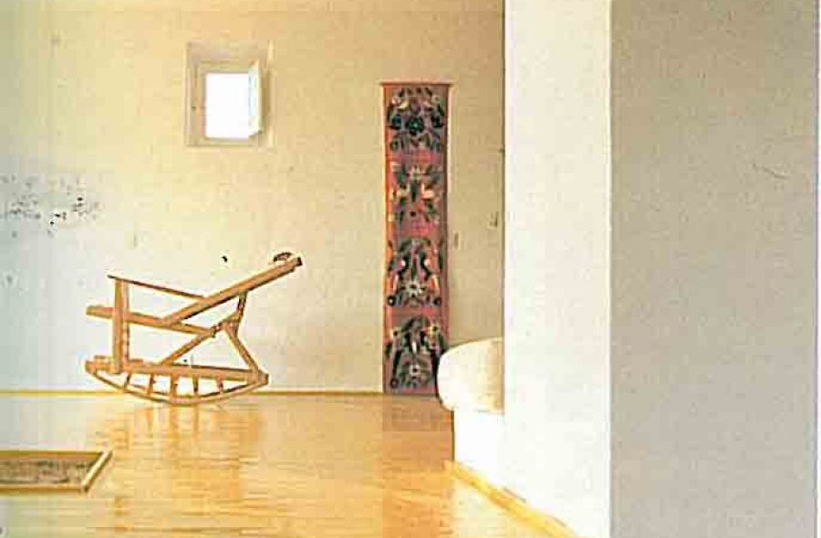 Restauro di una casa di campagna. Molto attento a non fare folklore. Giallo e verde, sono i colori della casa. Il pavimento ė risolto con listoni di legno laccati di color giallo. Da “Ville e giardini” – Foto O. Sancassani.
