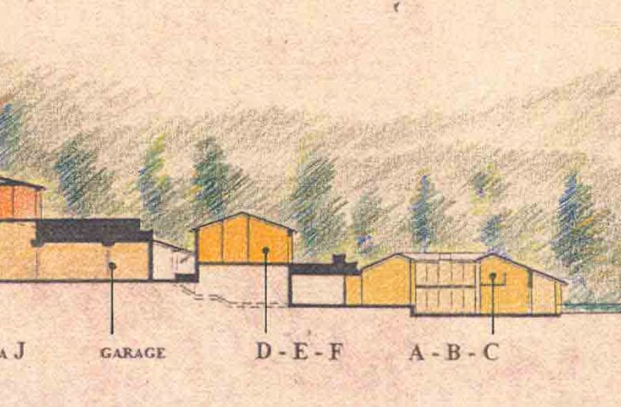 Con vista sui vigneti della collina d’oro, il complesso architettonico si sviluppa a vari livelli adattandosi ai declivi del terreno.