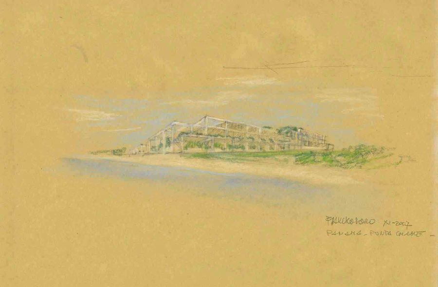 A salti le case corrono ai lati di una scalinata che finisce in mare. Le trabeazioni che contengono i volumi saranno invase da rampicanti.