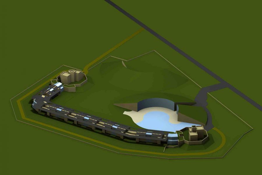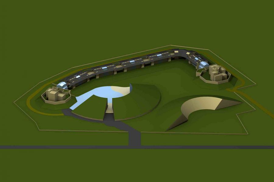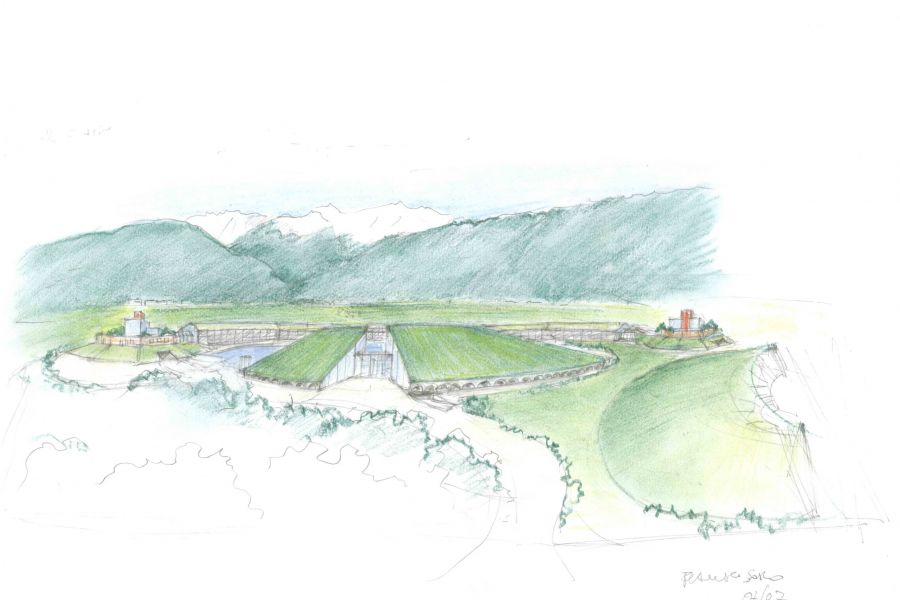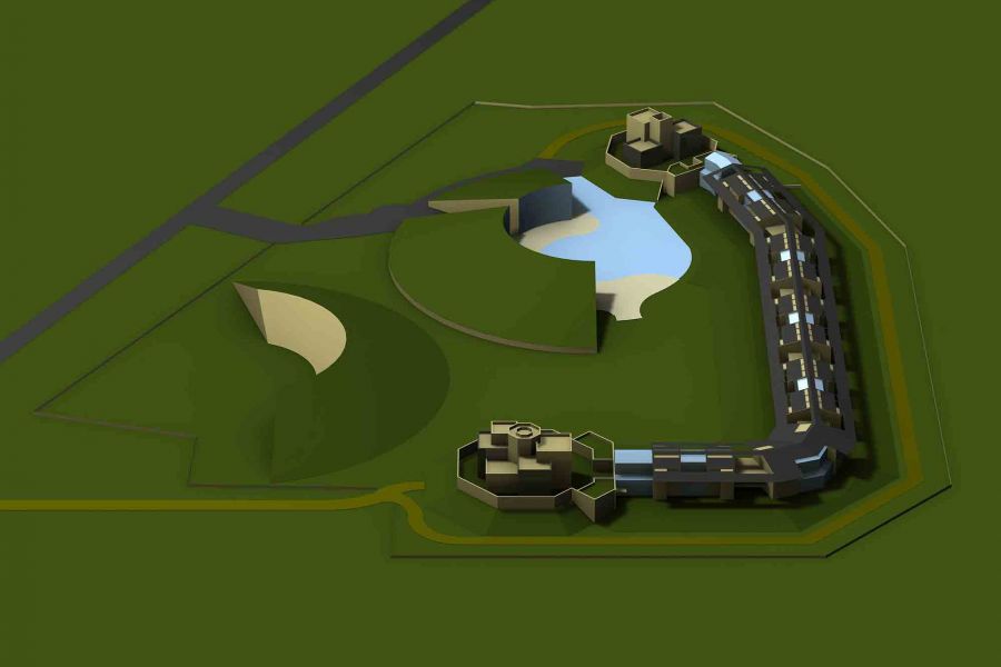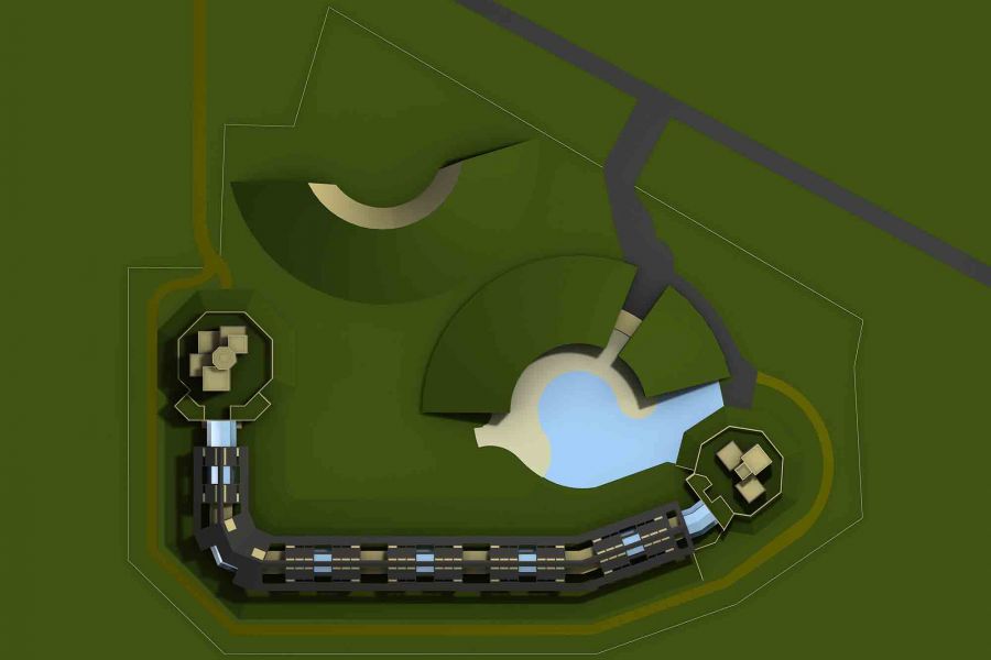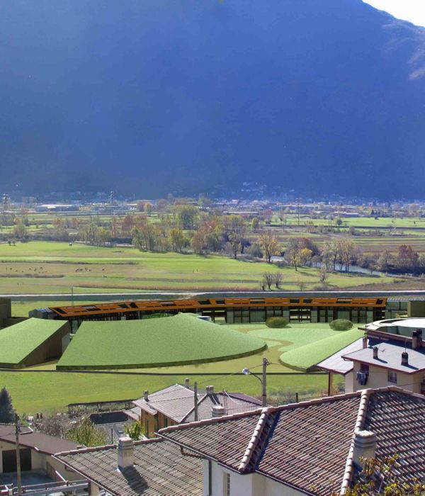 Tema difficile per le tre destinazioni, diverse tra loro, che devono convivere: la residenziale, la ricettiva e l’industriale. La risoluzione del progetto sta nei tronchi di cono rivestiti di verde che nascondono le volumetrie.