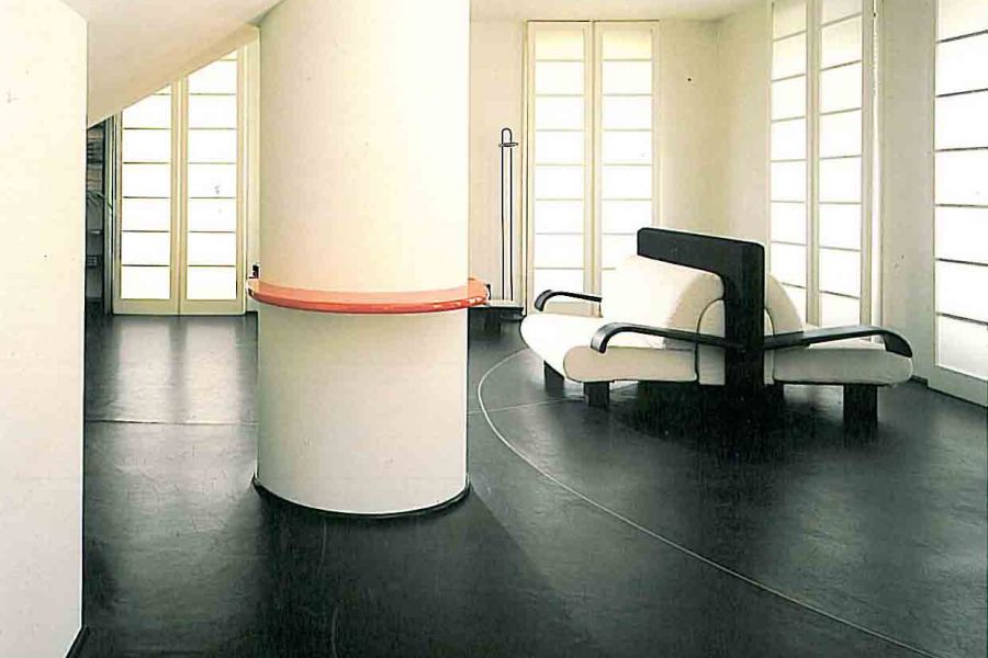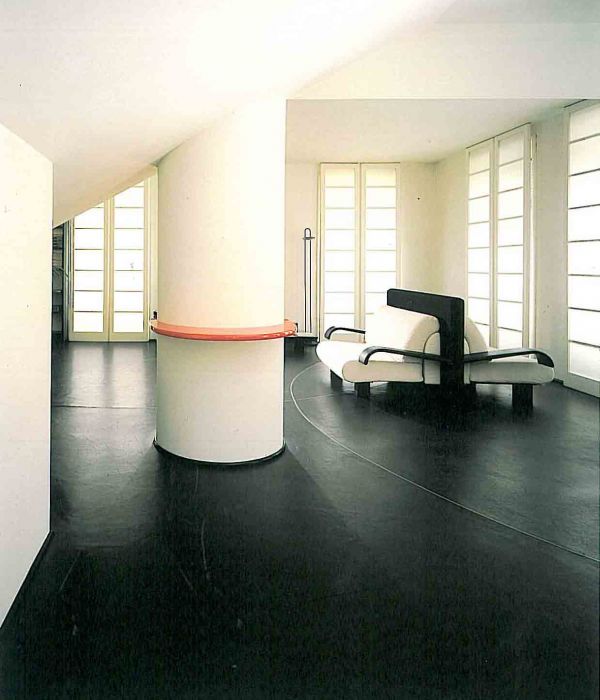 I due pensieri di rilievo sono le tende in vetro opaline bianco ed il pavimento in linoleum con fili di ottone che tracciano segni grafici in piena libertá.
